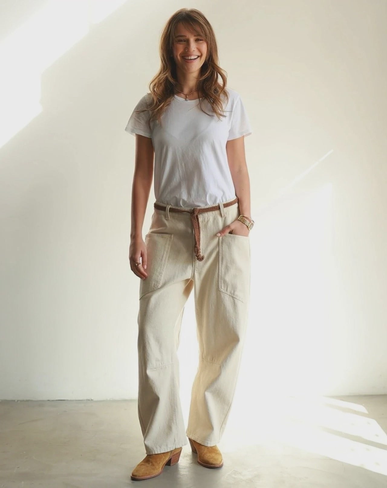 Juno Natural Baggy cropped faded denim natural shade pants and “ME” embroidery on the back pocket . Rope tie at the waist, five belt loops and two front pockets. Pair with your favorite tee or tank for a casual, easy to wear look.