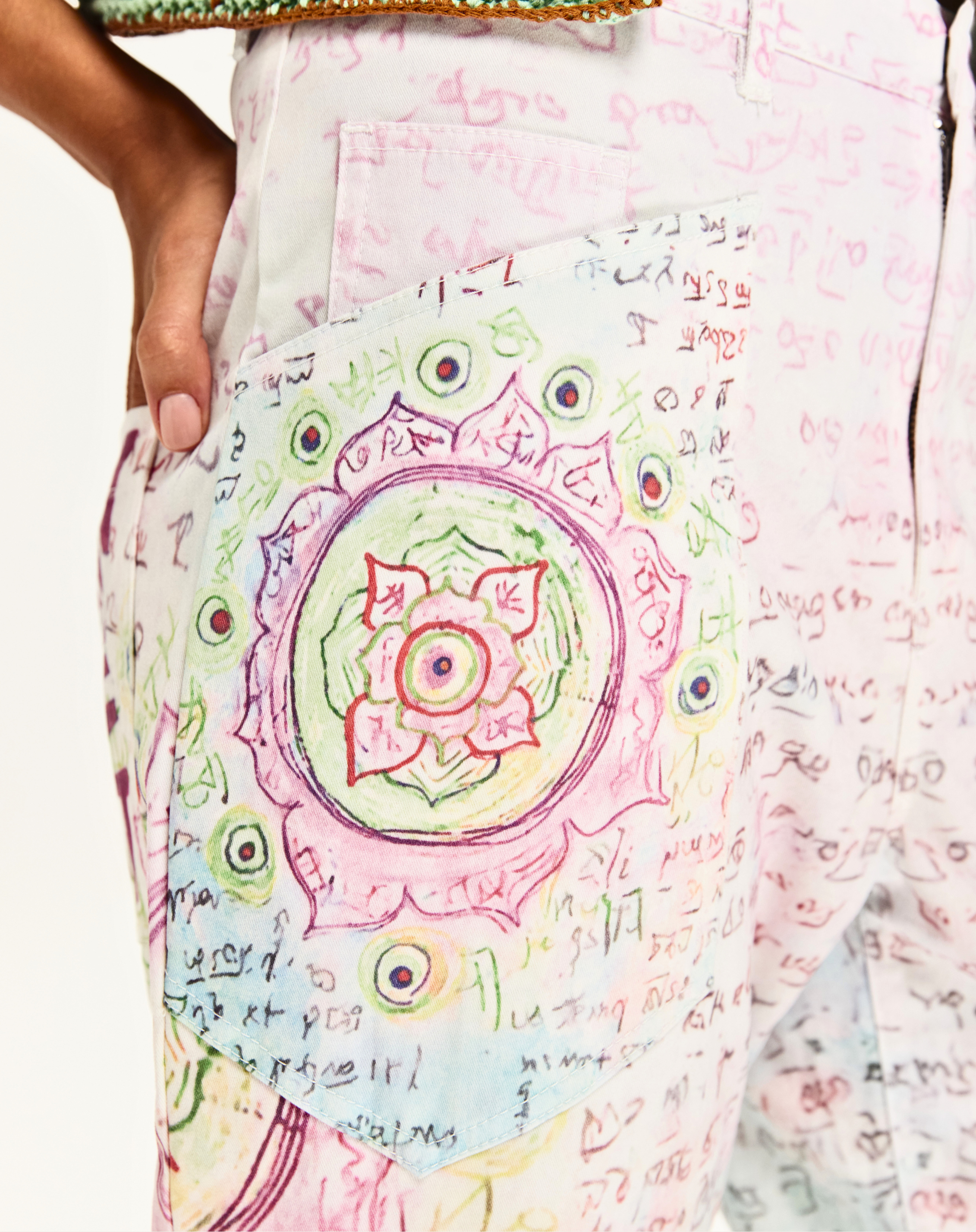 Dream in color with the Gala barrel pants featuring "TODAY WILL BE GREAT" in bold pink lettering. Soft pink fading to turquoise creates an ombré effect, adorned with mystical runic scripts, sacred geometry mandalas, and spiritual symbols throughout.