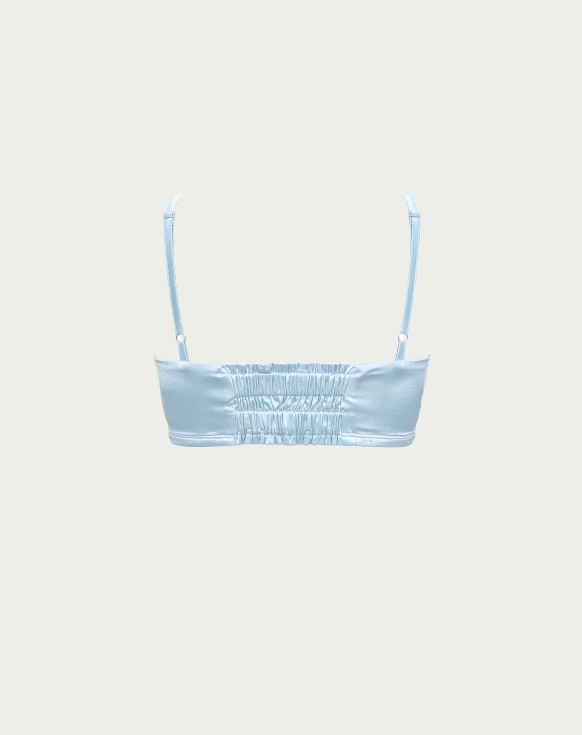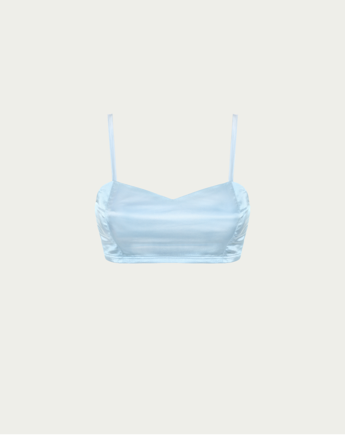 Spaghetti strap bra with elastic panel in back. Front has two curved vertical seams. Very cute with an open overtop for a feminine casual look.