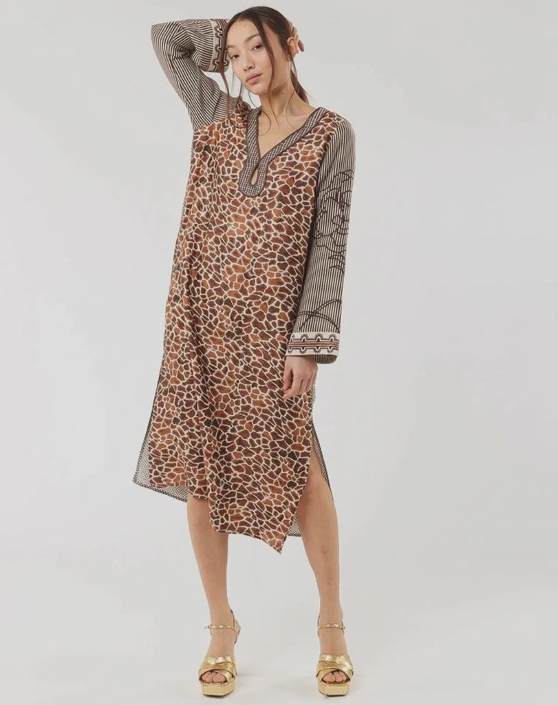 Mixed print, long, deep keyhole dress with flared sleeves and side slits. Front is leopard print, sleeves are flared and striped and back reads “Hello Gorgeous” and features a snakey graphic. Back has a checked print. Available in shades of chocolate. Perfect bathing suit cover up.