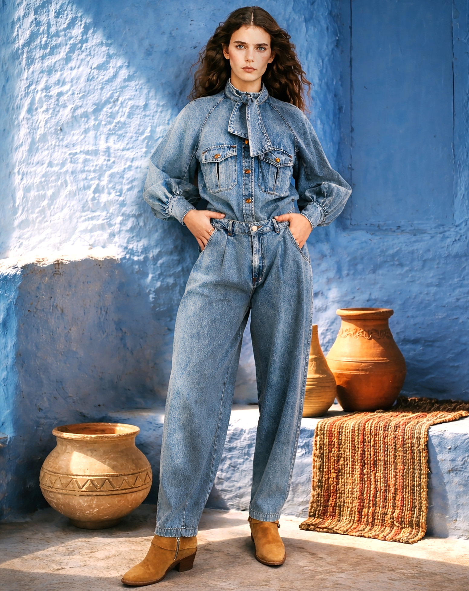 ELLA Cropped baggy washed denim pants with belt loops and two side pockets. These relaxed denim pants go perfectly with a simple T Shirt or the matching bow tie denim shirt for a nostalgic - chic look.