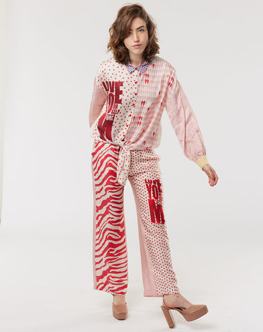 Mixed print straight leg trousers with two side pockets, two back pockets and faux fly. Contrasting elastic waistband. Prints are geometric. Predominant colors are red, pink and off white with a touch of blue. Pant leg reads “LOVE YOURSELF MORE” on one leg.These trousers pair beautifully with either our Isabel blouse or our Sofia blouse for a fun easy to wear look.