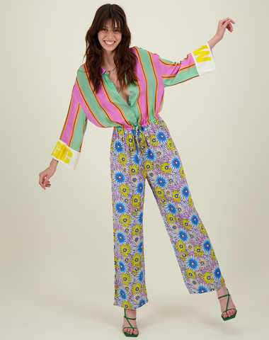 Super cute loose fit overall in contrasting prints. Top is pink and green striped with large cuffs in yellow that read “MAGIC”. Bottoms are a vibrant floral print in lavender,blue and yellow. Tie waist and two side pockets. Back features a large parrot graphic. Boho chic look.