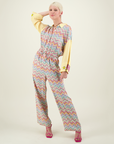 Super cute loose fit overall in a vibrant geometric print. Collar and long sleeves are in contrasting yellow striped print. One cuff reads,”YOU ARE AMAZING”. “Me” crown is on the back. Tie waist with two side pockets. Boho chic look.