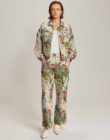Noelle Rose Red Jacquard Woven Jacket with two packets in the front.