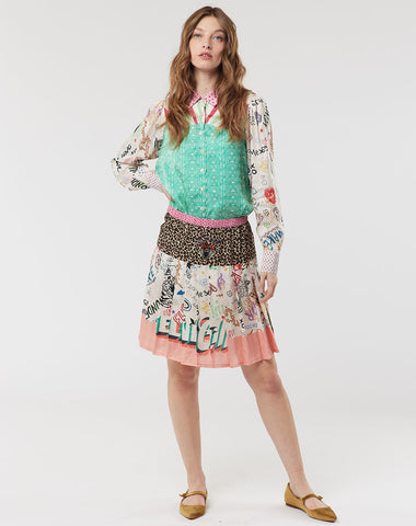 Super cute pleated tiger graphic short skirt. Elastic waistline. Wide horizontal leopard print stripe below waistband. Reads “FEELING Chill” at the bottom. Vibrant colors. Pair this skirt with our tank or tee for a boho chic look.
