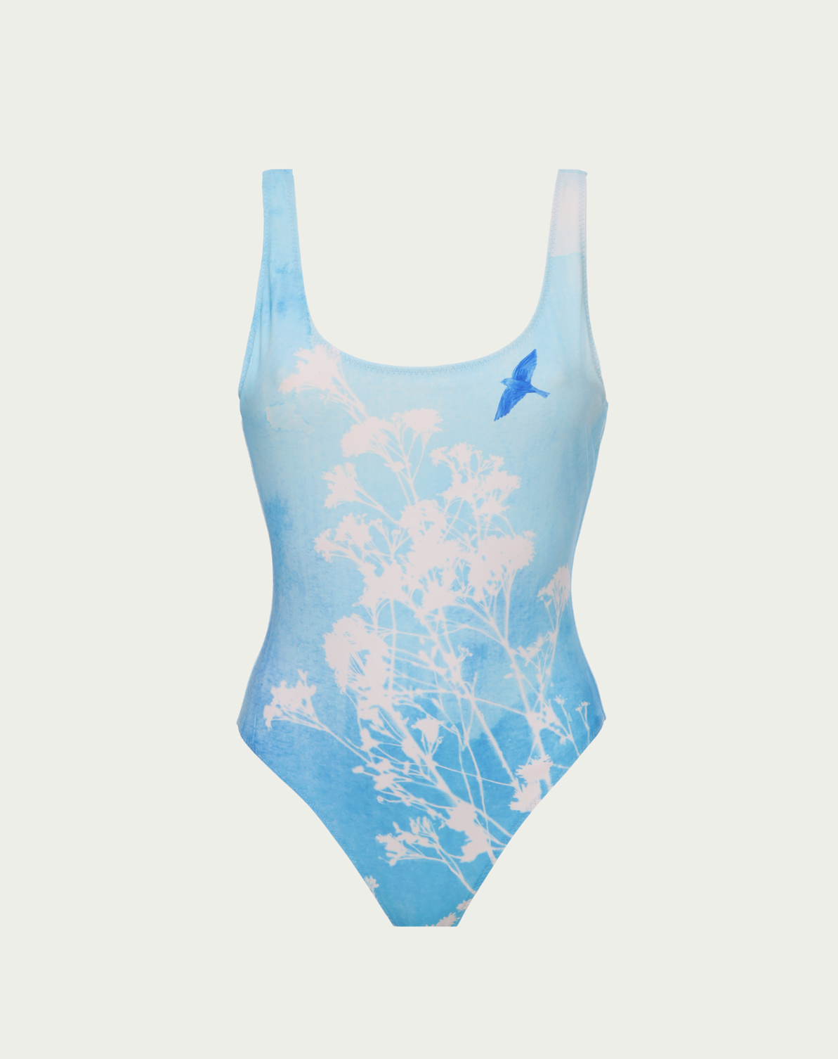 Dive into artful elegance. This stunning one-piece swimsuit features a gradient from sky blue to deep indigo, adorned with delicate botanical prints and a graceful bird in flight. The flattering scoop neckline and sleek silhouette create a timeless look.
