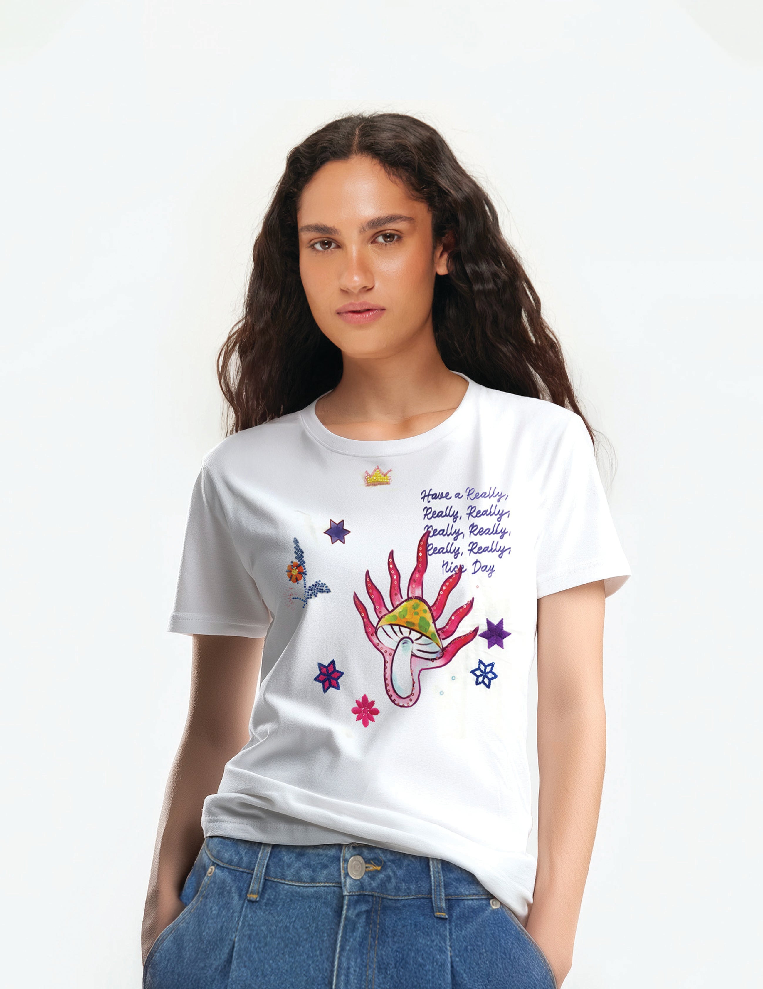 Have a really nice day with the Sia tee from our Markers collection, featuring a whimsical drawn mushroom with pink rays radiating outward. Purple script declares "Have a Really, Really Really, Really, Really, Really, Really Nice Day" alongside the magical illustration.