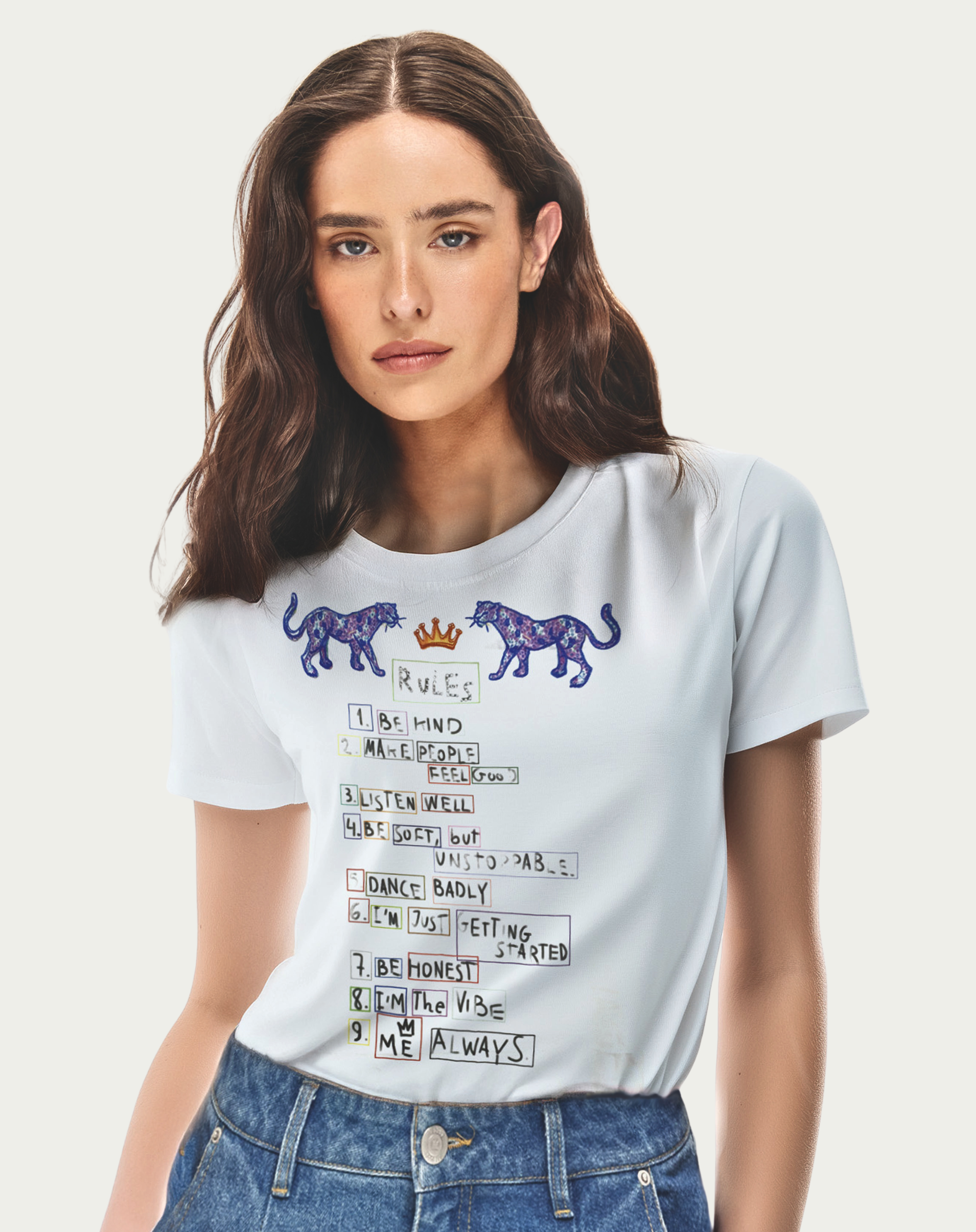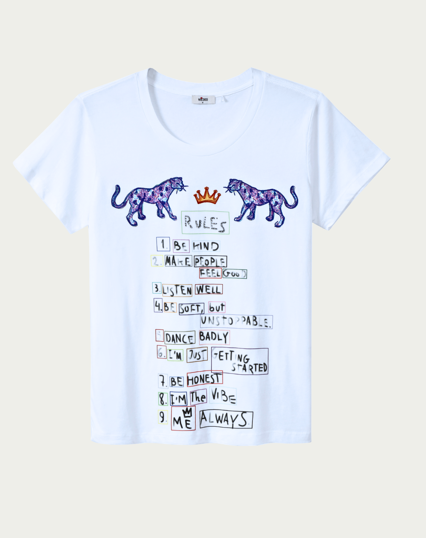 Live by your own rules with the Sia Wild tee from our Markers collection, featuring two majestic purple panthers with geometric patterns flanking a golden crown and hand-drawn "RULES" text at top.