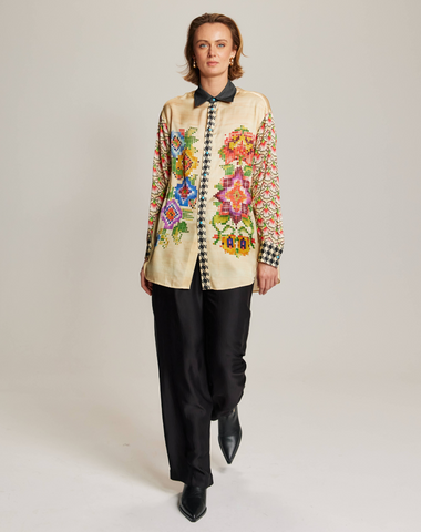 Classic long sleeve collared shirt with two front pockets with flaps. Print is black denim. Back reads,”AMORE” across the top. Pair with our matching skirt or pants for a artistic look.