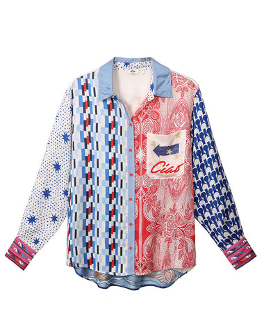 Mixed print button down long sleeve classic shirt with collar and cuffs. The front of the shirt mixes geometrics and florals. There is a small pocket which reads “Ciao”. The back reads ”I AM energy!” at the top and features beautiful Asian inspired boats. Pair this shirt with our Vanessa midi skirt or our Ember track pants for a fun sophisticated look
