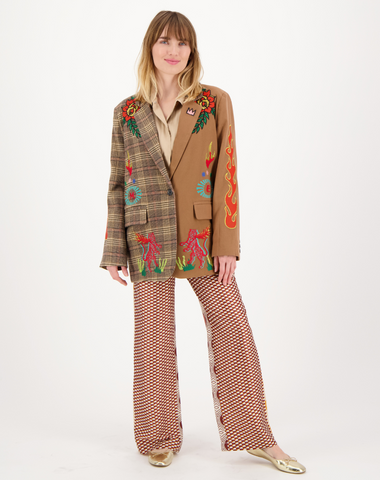 Vintage looking blazer style jacket with collar, lapels and two pocket flaps. One side is grey checked, the other side is sand. One button closure in front, three buttons on each sleeve. Jacket features colored graphics such as dragons, flowers and flames on sleeves. Back is plain. Pair this jacket with jeans for a boho, arty look.