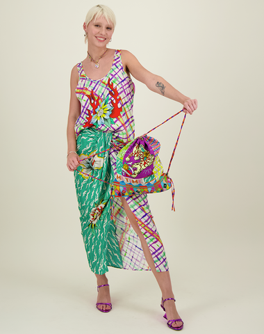 Round neck mixed print loose fit tank top. Front is diagonal wide stripes with a fabulous tiger graphic. It reads,”I’M SO HAPPY”. Back is a diagonal contrasting check print with a large floral graphic. Pair with our casual pants or shorts for a sporty feminine look.