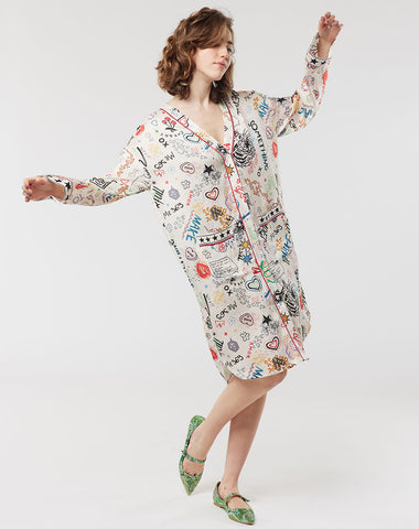 Long sleeve, V-neck, button down graphic tiger print midi dress. Two front pockets. Graphic tiger print on both front and back. Vibrant colors. Whimsical chic look.