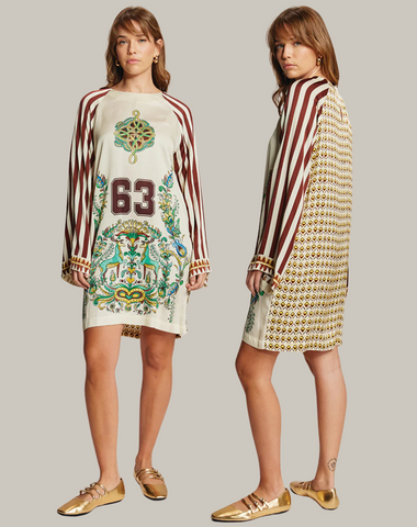 Our Alani dress comes in all three of our patterns. Dress is a mini with a rounded neck, long loose sleeves, pleats and a button closure in the back. Dress it up or down for a feminine, vibrant look.