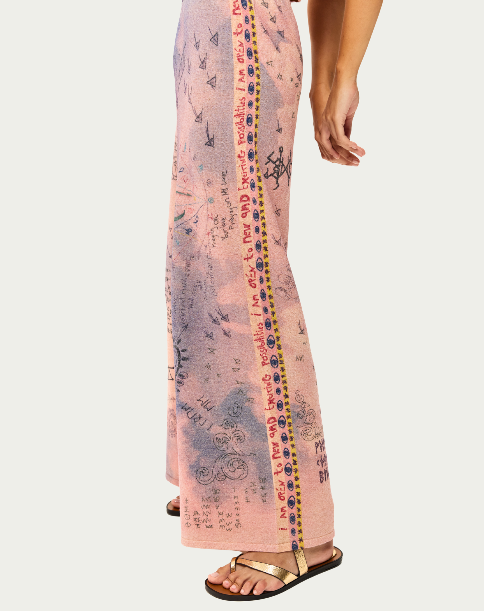 Flow with spiritual energy in the Michelle pants featuring soft pink and lavender panels adorned with sacred geometry, runic arrows, and delicate floral illustrations. Mystical symbols and tribal patterns create a unique bohemian aesthetic.