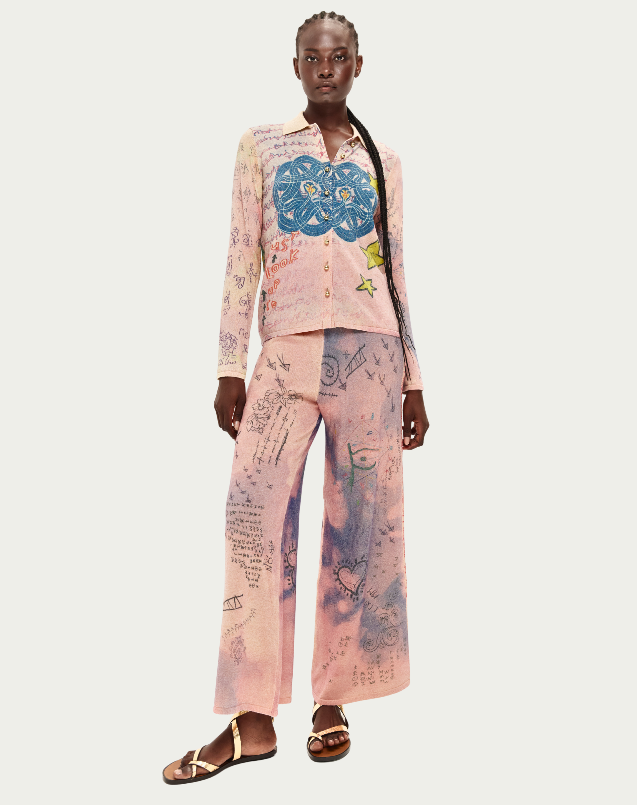 Find your calm in the Serenity knitted cardigan featuring a bold blue sacred geometry mandala at center with vibrant yellow stars. Soft pink knit with watercolor washes in lavender and peach creates a dreamy backdrop, while mystical runic scripts scatter throughout the design.