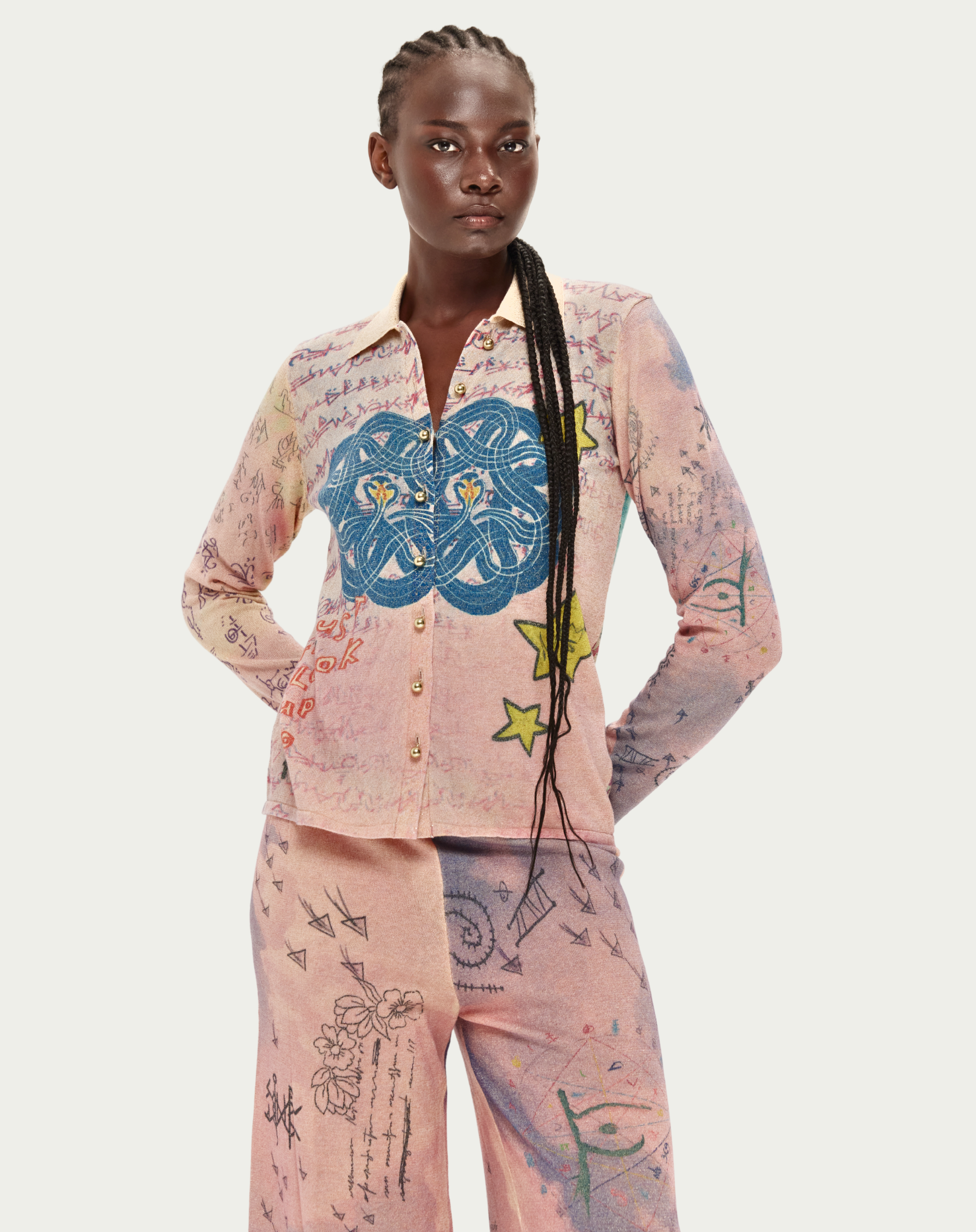 The classic collar and button-front closure offer timeless style, while the cozy knit fabric provides warmth and comfort. This spiritual statement piece blends bohemian artistry with everyday wearability.