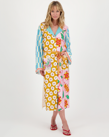 Belted kimono dress in our Lucky Me pattern. Long sleeves and lapels. Every part of the dress is a different pattern. Dress reads “Let’s play games” across the top of the back. Wear this dress and add some retro glamour to your wardrobe.