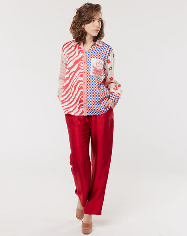 Mixed print long sleeve classic shirt with button down front, contrasting collar and cuffs. Prints are geometric, stripes and florals. Predominant colors are red, pink, off white and blue. Small pocket in front. Reads “LOVE” on the back. Pair this top with our Bailey straight leg trousers or our DIANA pleated skirt for a vibrant, complete look