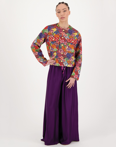 Adorable collarless cropped jacket in Twisted Love pattern featuring a beautiful, colorful floral print. Jacket has two breast pockets and a 5 button closure. Pair with our Annie pants for an artistic, feminine look.