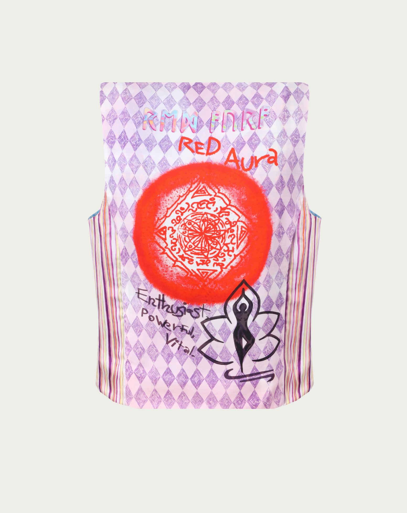 Cameron vest featuring "CHAKRA ENERGY RED AURA" text and a vibrant red root chakra mandala on the back. The front showcases mystical symbols including hearts, crescents, and spiritual motifs in soft lilac tones.