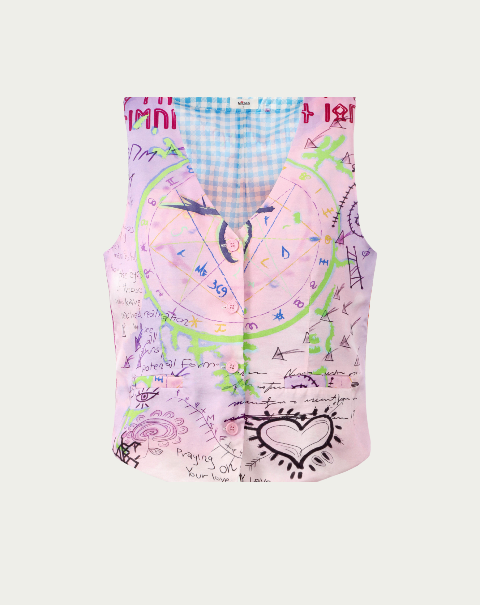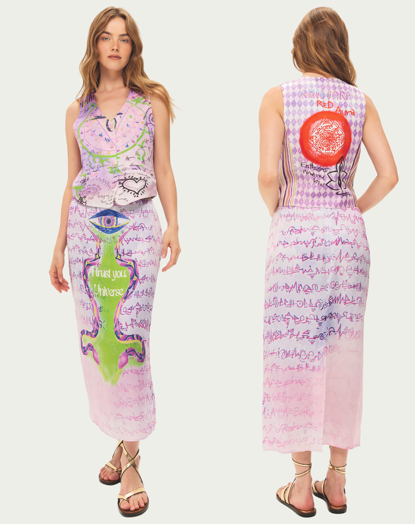 Diamond geometric patterns and vertical stripes create visual dimension, while runic scripts throughout celebrate ancient wisdom. The sleeveless V-neck design layers beautifully over tees or pairs perfectly with the Valery pencil skirt for a coordinated spiritual look.