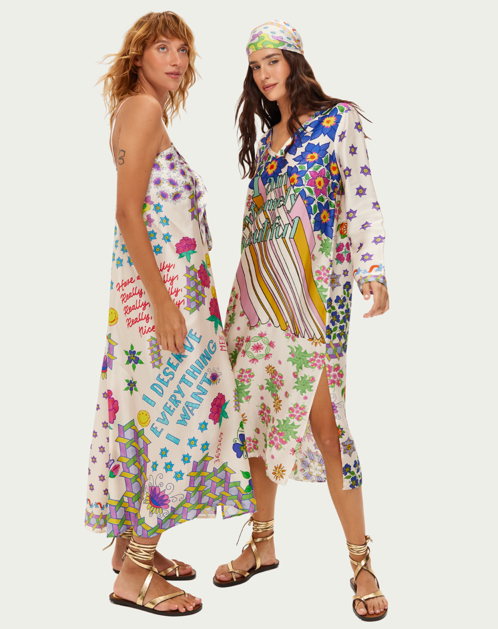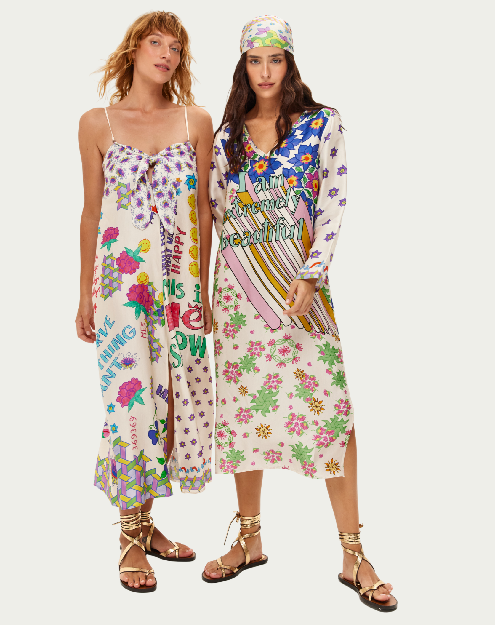 Celebrate "This is ME NOW" with the Eli maxi dress from our Markers collection. Large hand-painted flowers in pink and purple blend with sharp geometric shapes and yellow smiley faces, while bold lettering declares "WHAT MAKES ME HAPPY" in vibrant marker colors.
